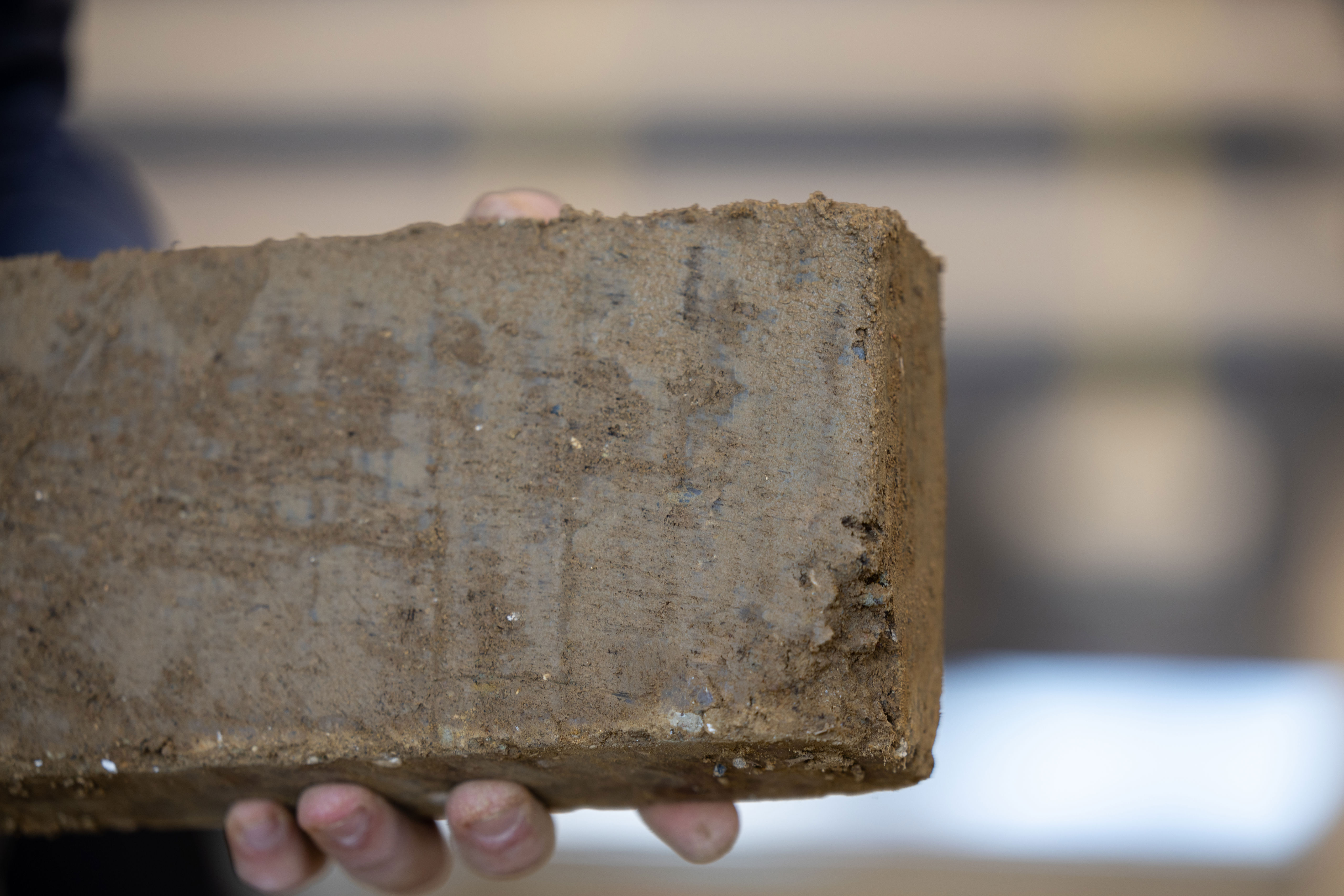 Murerbaljen er fyldt med lermørtel. Murerelev Jeppe Hedeager Andersen dykker murerskeen ned i baljen, samler en klat mørtel op og smider den på sine mursten for at gøre klar til næste sten. I hånden holder han en lersten, han sætter oven på sin klat mørtel.