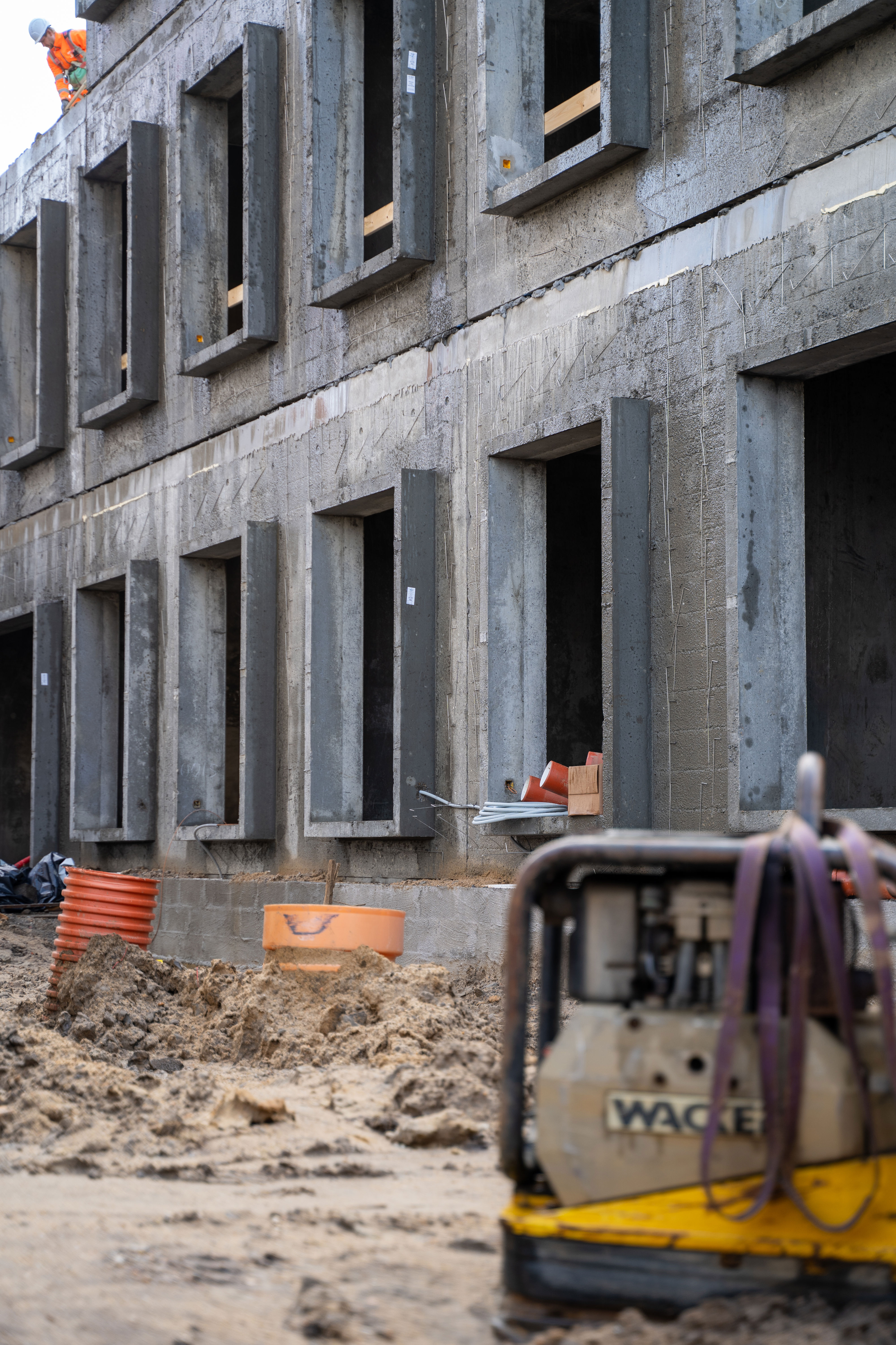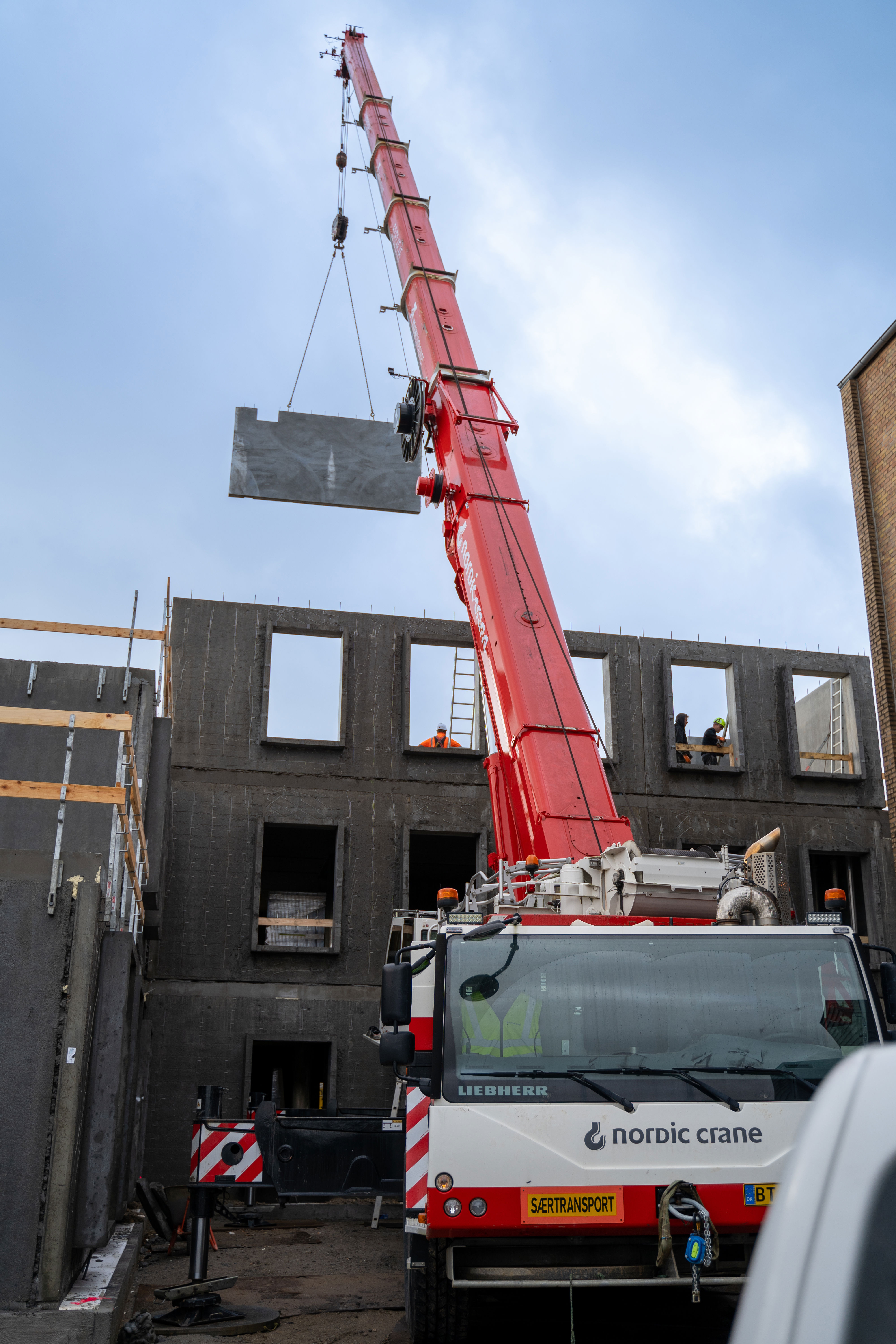 Den gule hjelm sidder sikkert på hovedet af betonarbejderen, og hænderne arbejder omhyggeligt med at hænge de kraftige kæder fast på det rå betonelement. Få sekunder senere svæver den i luften og er klar til at blive monteret på 3. etage.